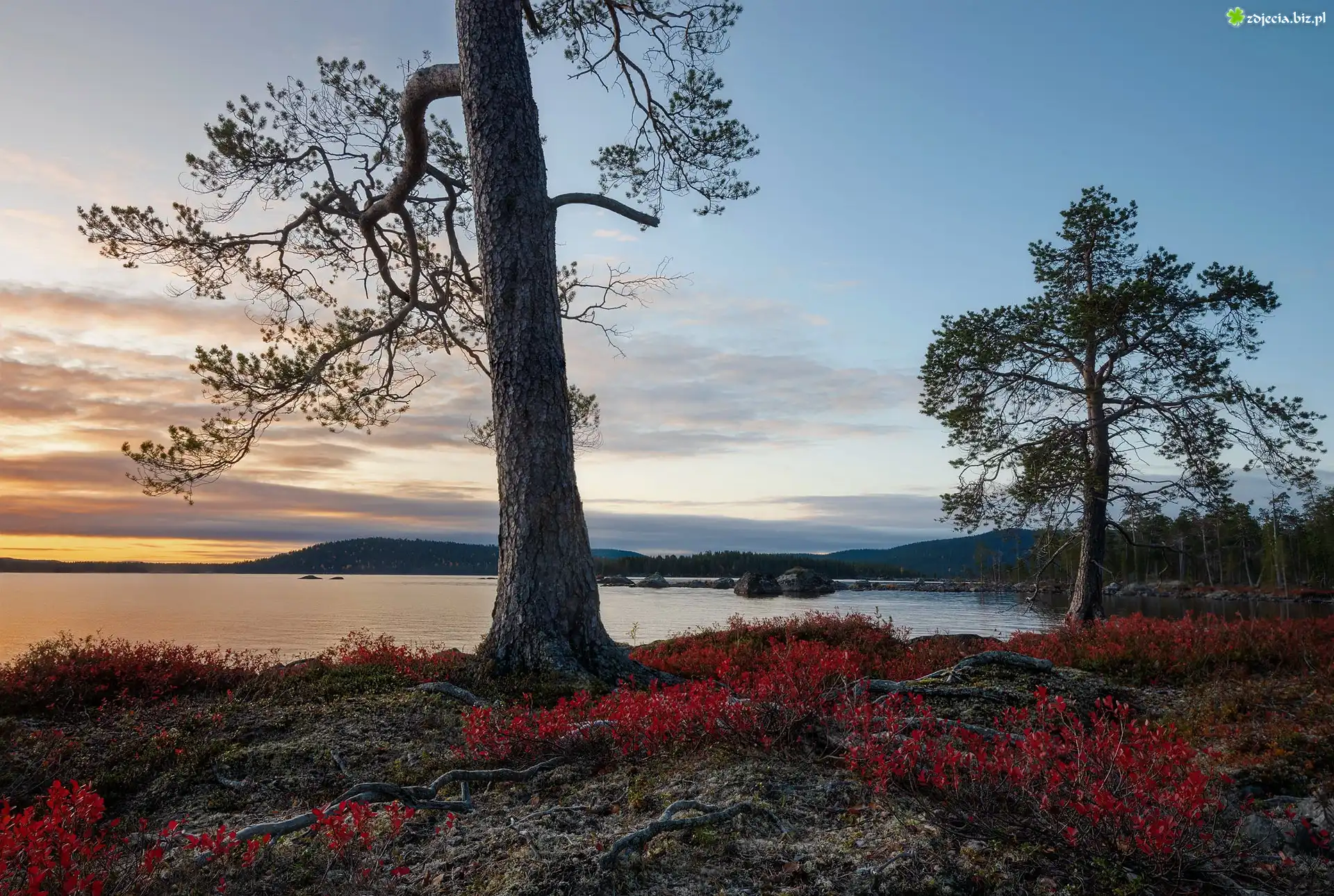 Zdjęcie Zachód słońca, Jezioro, Kamienie, Drzewa, Rośliny