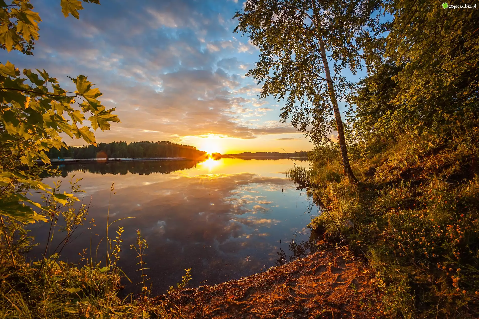 Zdjęcie, Zachód słońca, Jezioro, Drzewa, Brzoza