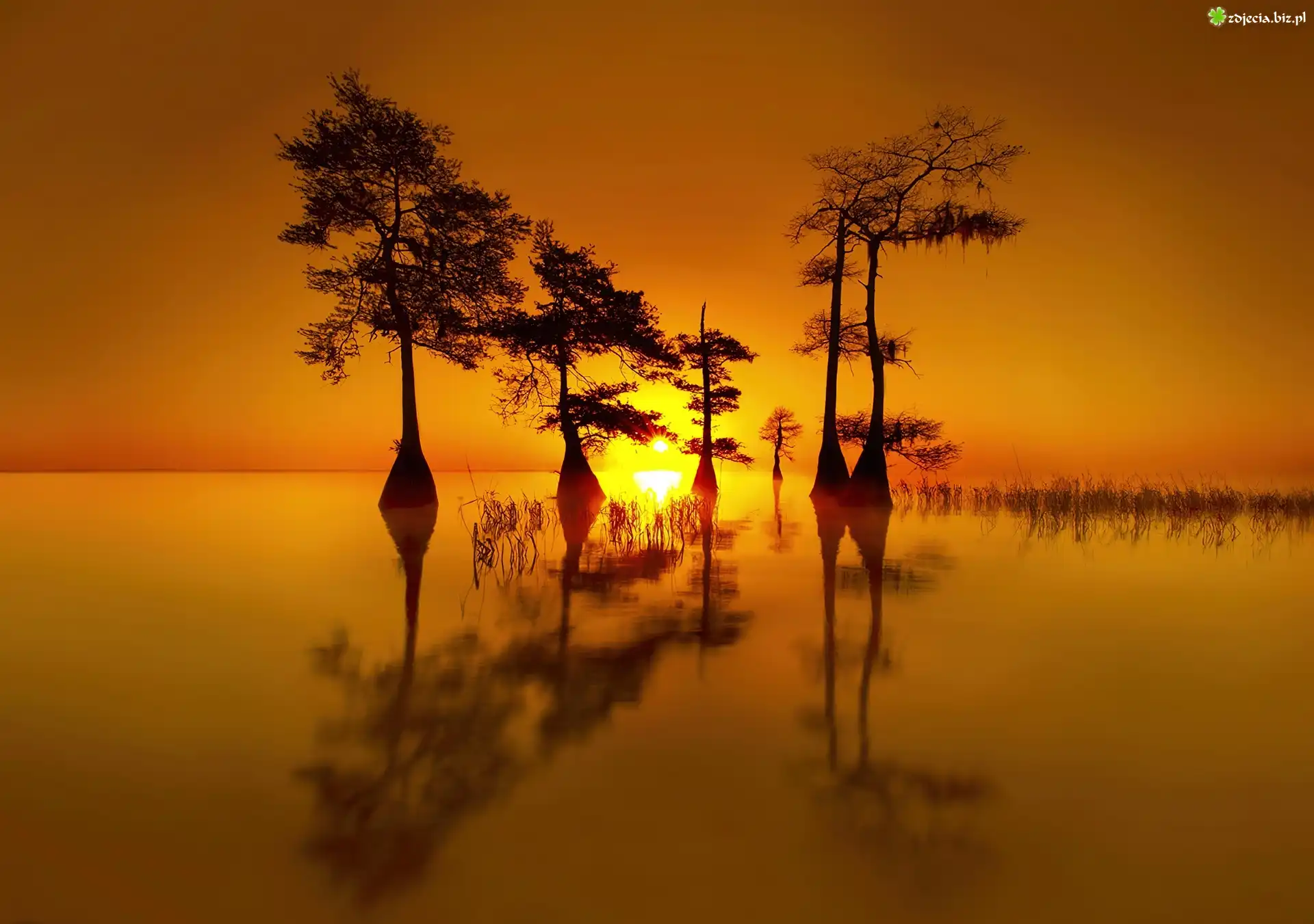 Zdjęcie Zachód, Słońca, Jezioro, Drzewa, Odbicie