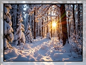 Zdjęcie, Zima, Las, Drzewa, Zachód słońca, Grafika AI