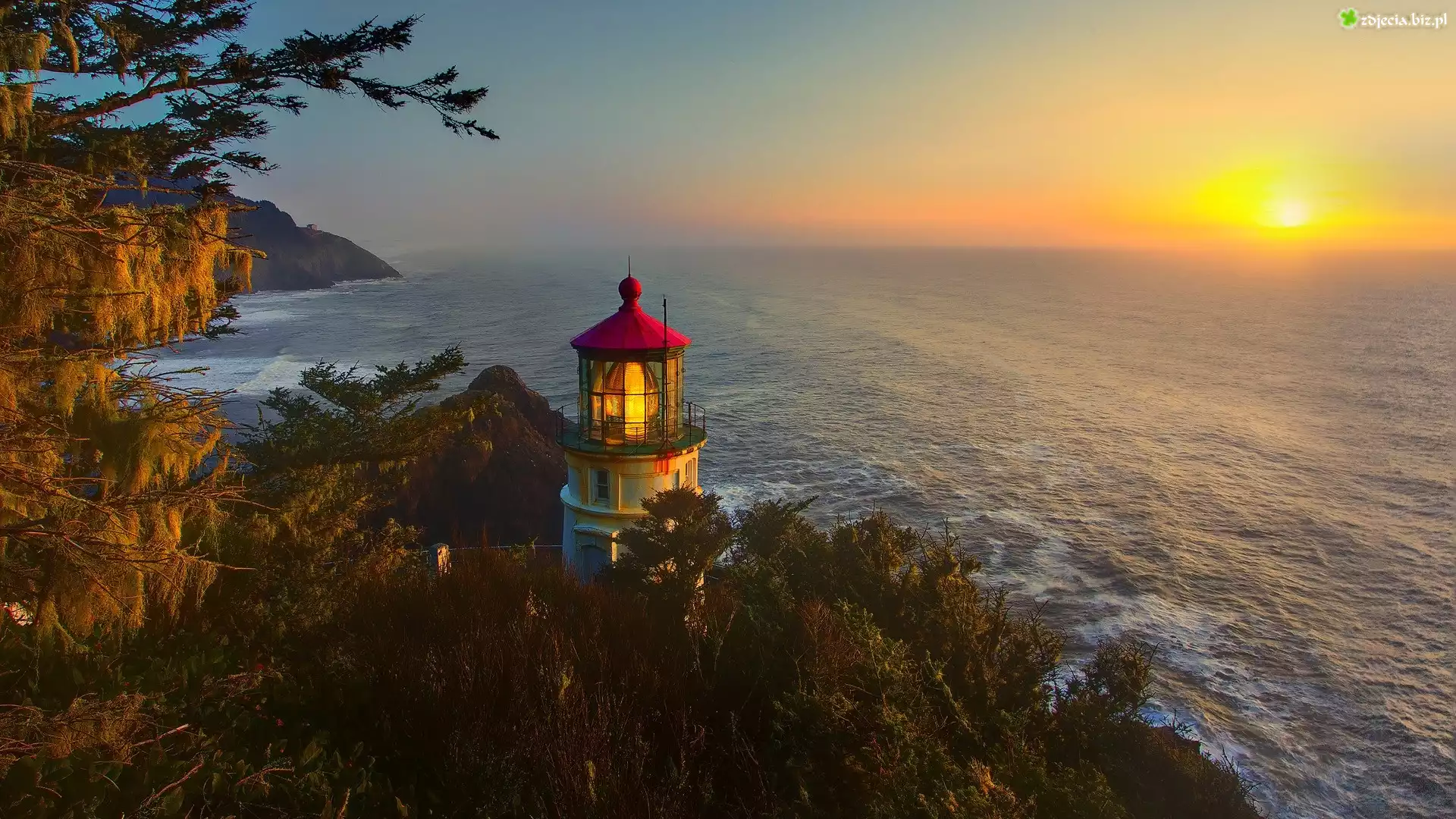 Zdjęcie Zachód, Słońca, Morze, Brzeg, Drzewa, Latarnia