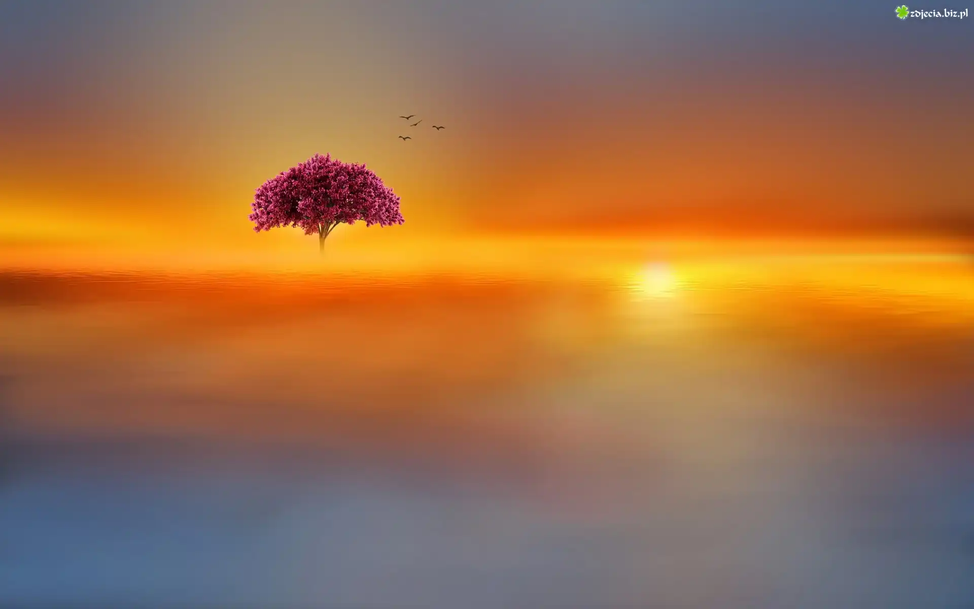 Zdjęcie Zachód, Słońca, Jezioro, Drzewo, Ptaki