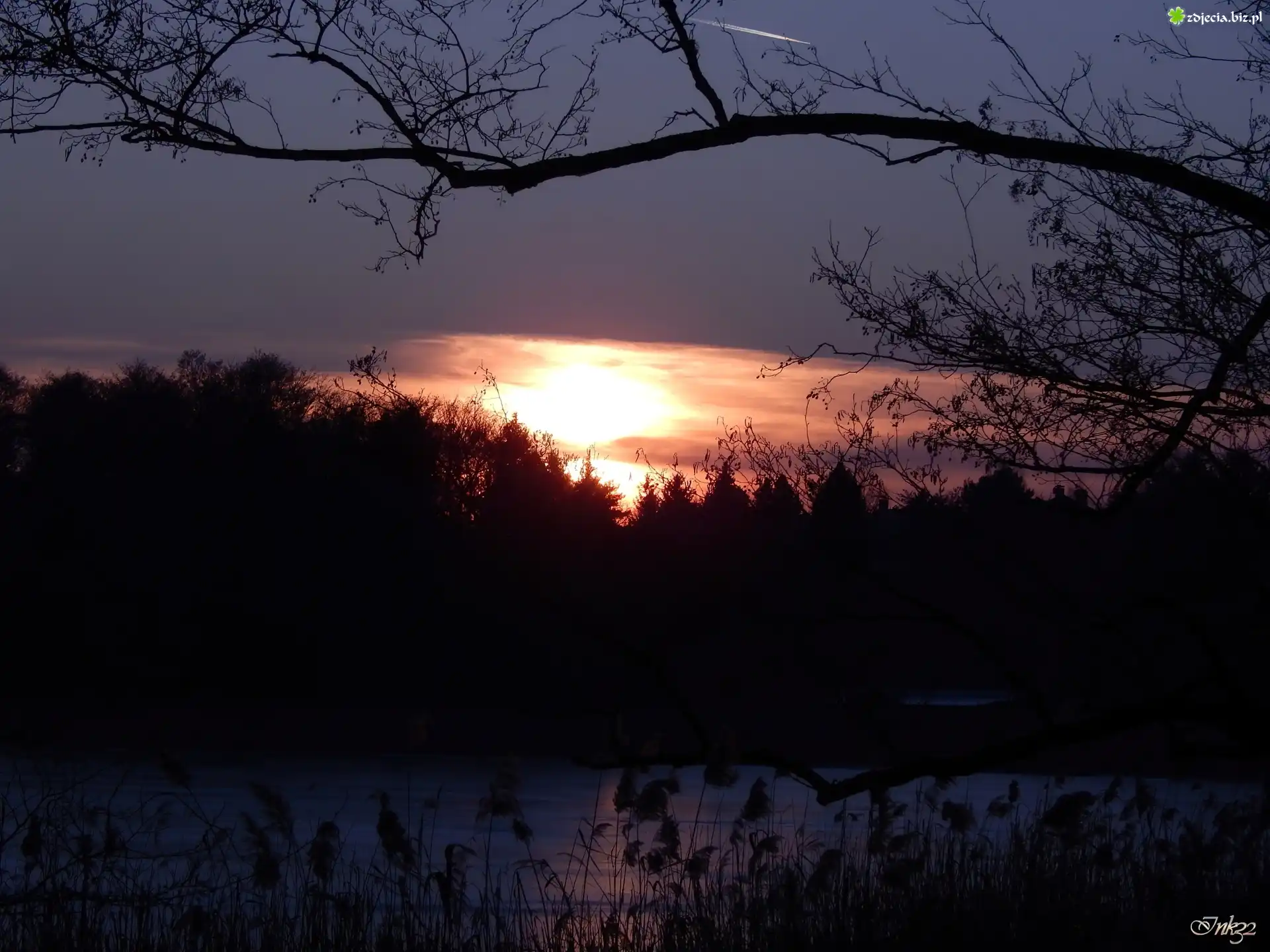 Zdjęcie Zachód, Słońca, Drzewa, Gałęzie, Trzcina