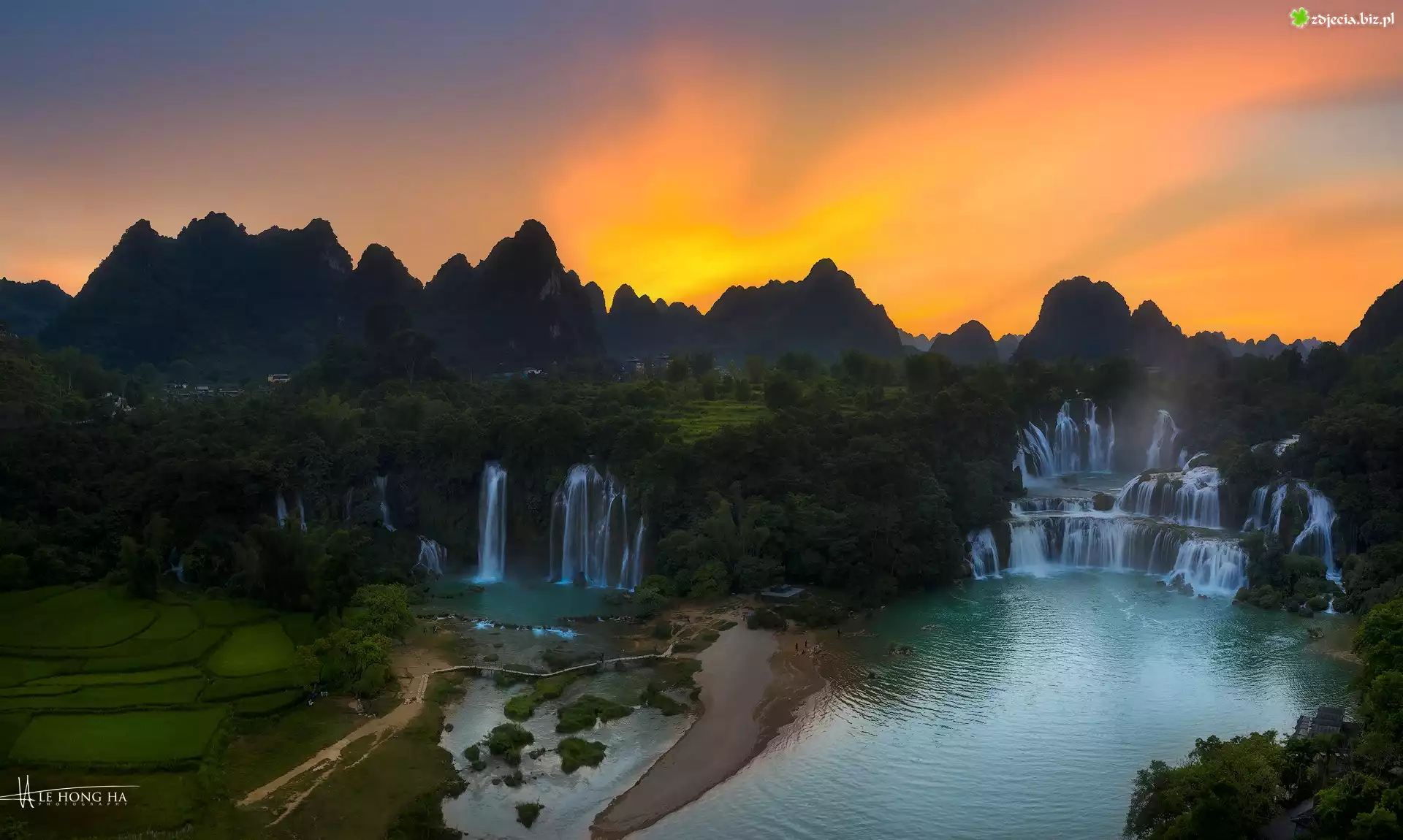 Zdjęcie Wodospad, Ban Gioc Waterfall, Jezioro, Rzeka, Cao Bang, Góry, Zachód słońca, Wietnam