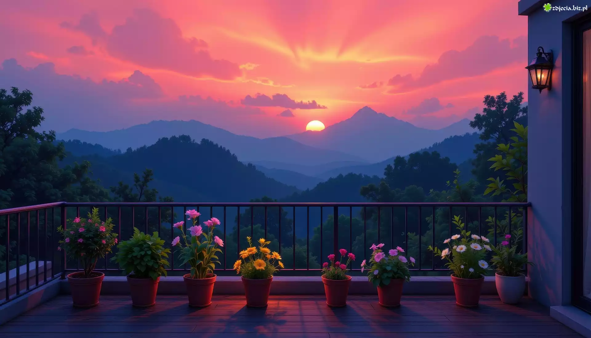 Zdjęcie Kwiaty, Doniczki, Balkon, Zachód słońca, Góry