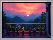 Zdjęcie, Kwiaty, Doniczki, Balkon, Zachód słońca, Góry