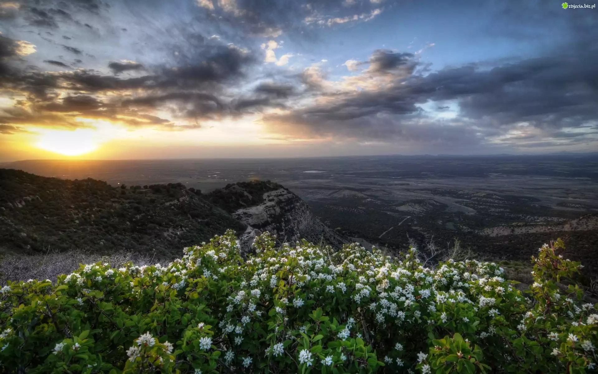 Zdjęcie Zachód, Słońca, Chmury, Góry, Kwiaty