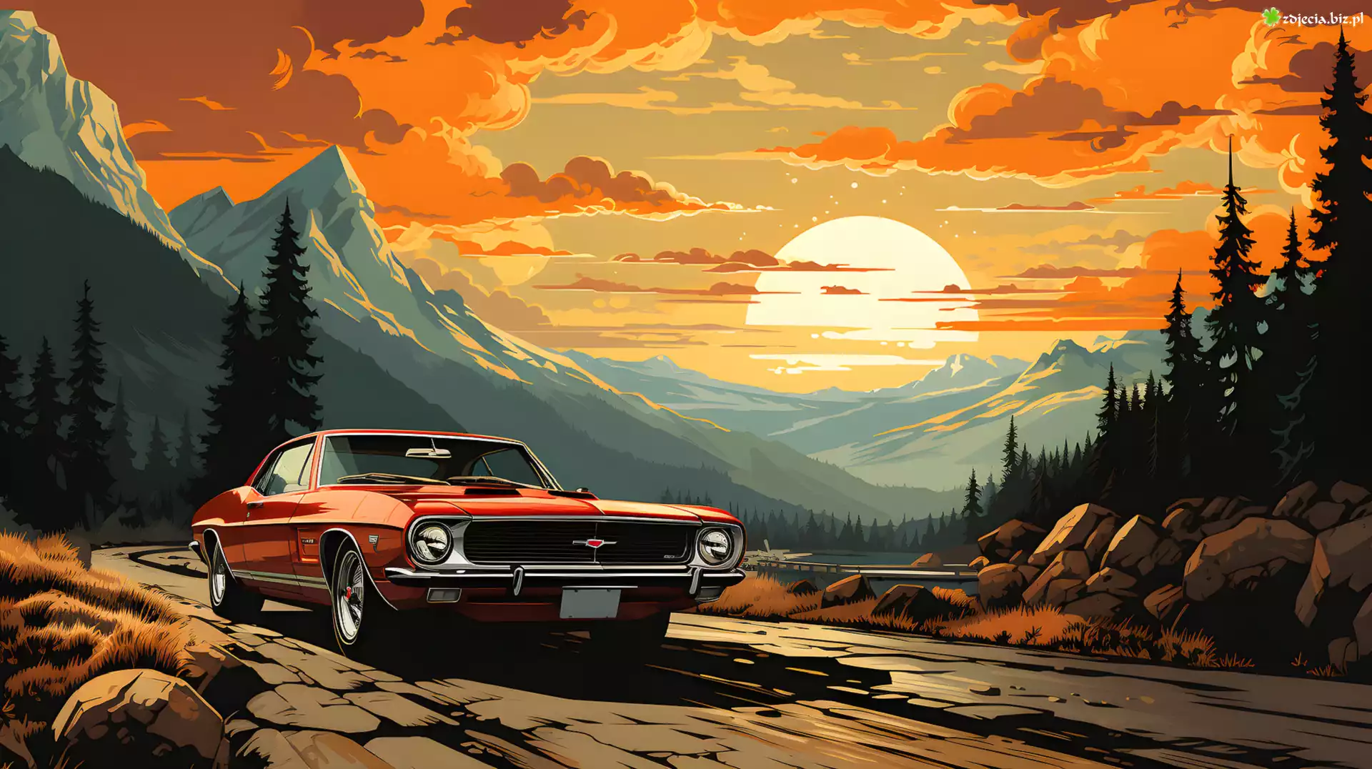 Zdjęcie Samochód, Droga, Góry, Zachód słońca, Grafika 2D