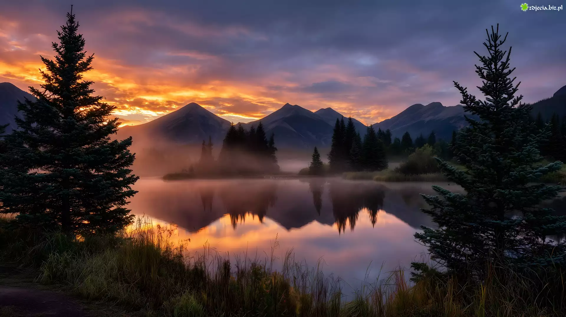Zdjęcie Drzewa, Jezioro, Góry, Zachód słońca, Grafika AI