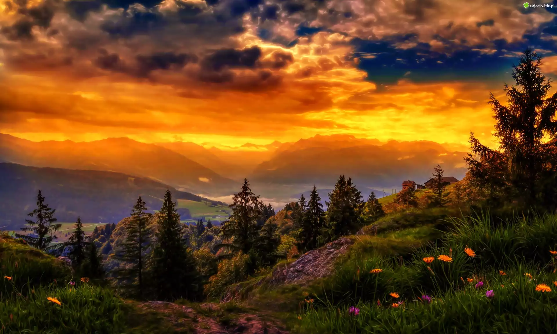 Zdjęcie Zachód, Słońca, Góry, Drzewa