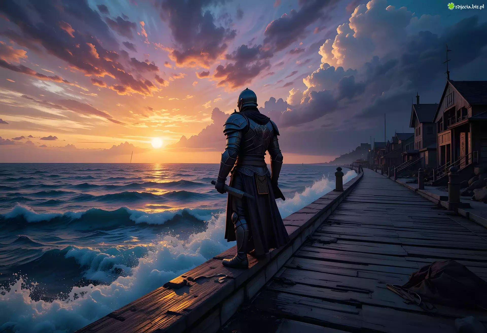 Zdjęcie Morze, Rycerz, Domy, Zachód słońca, Grafika