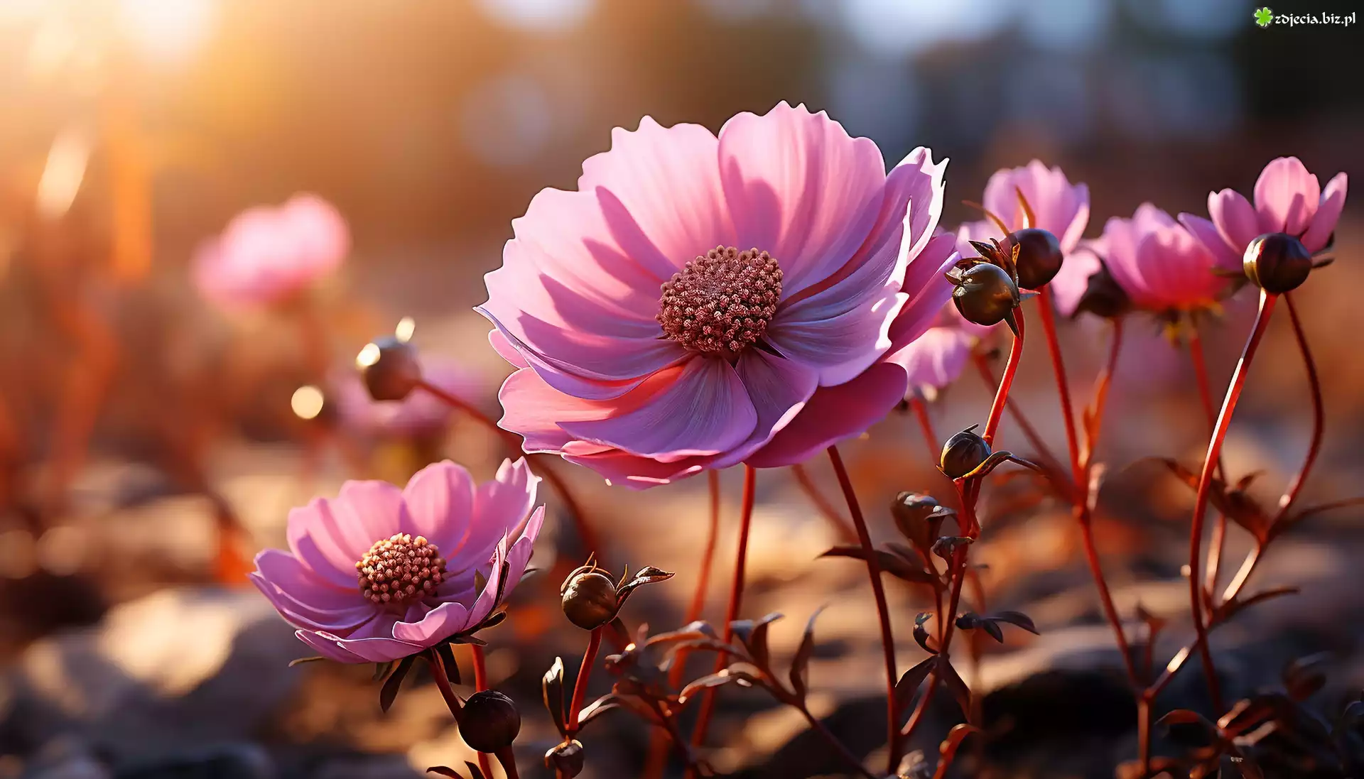 Zdjęcie Różowe, Kwiaty, Kosmea, Zachód słońca, Grafika