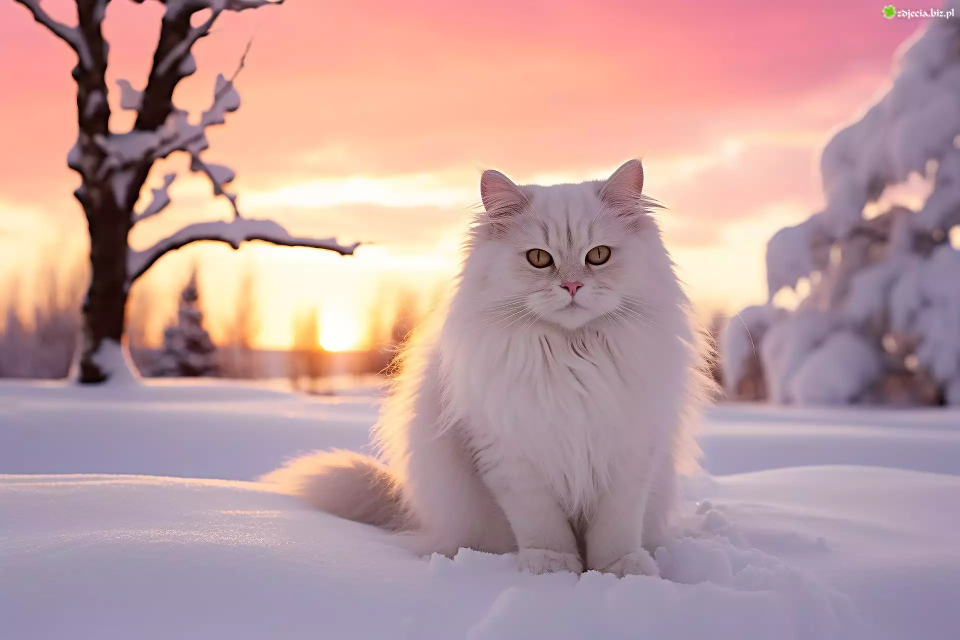 Zdjęcie Zima, Biały, Kot, Zachód słońca, Grafika
