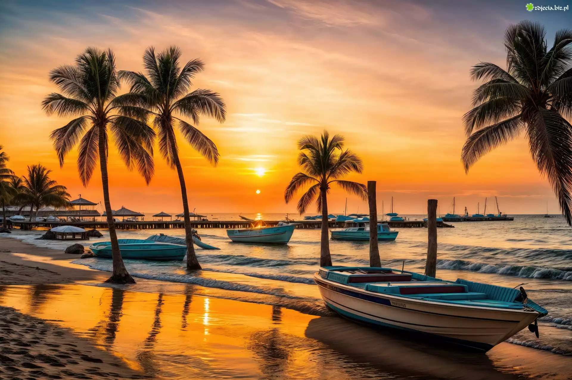 Zdjęcie Morze, Łódki, Palmy, Zachód słońca, Grafika