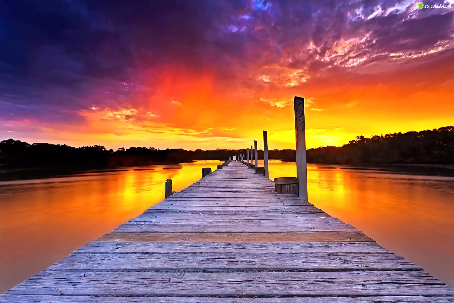 Zdjęcie Zachód, Słońca, Chmury, Lasy, Jezioro, Pomost