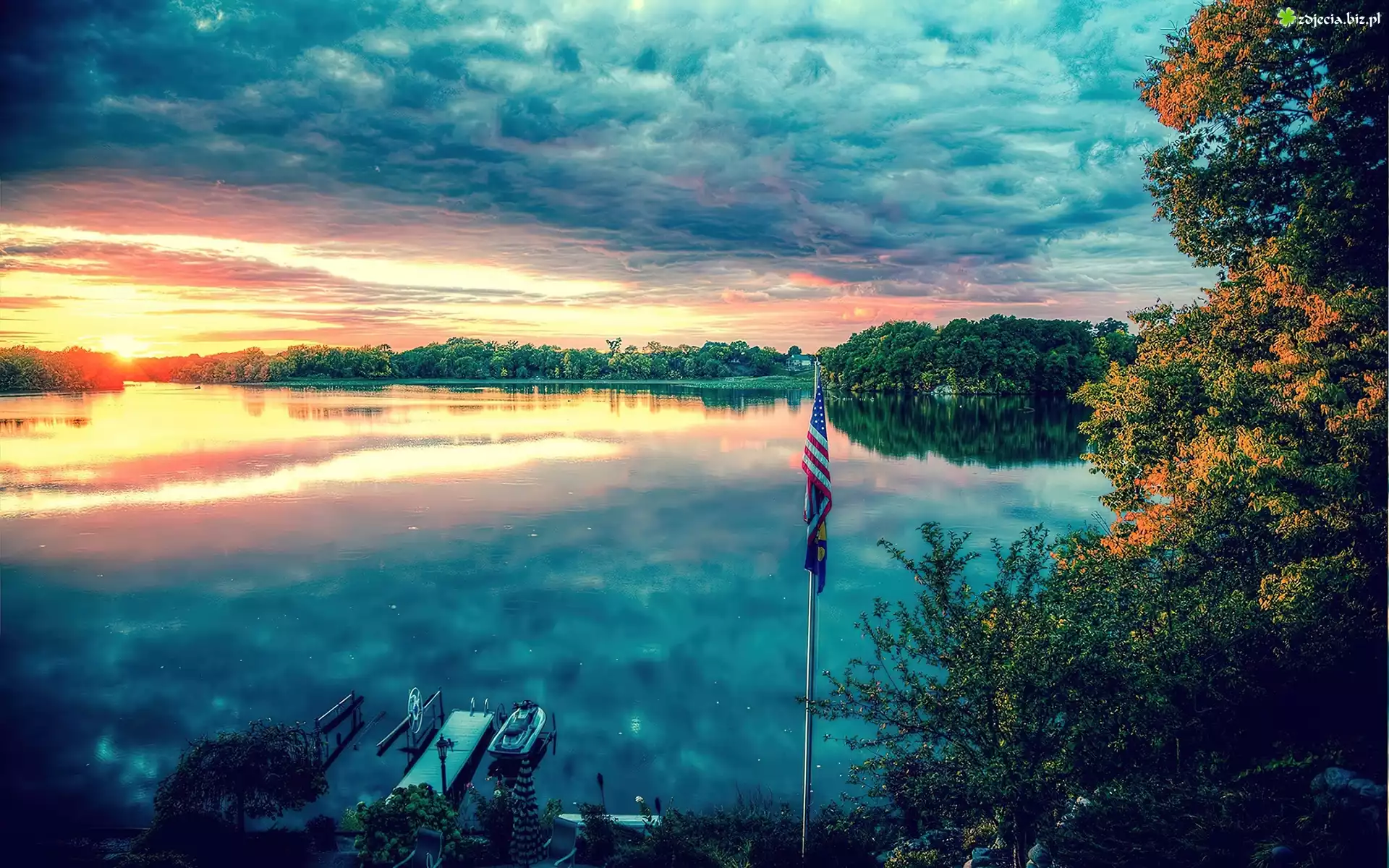Zdjęcie Jezioro, Zachód, Słońca, Pomost, Motorówka, Maszt, Flaga