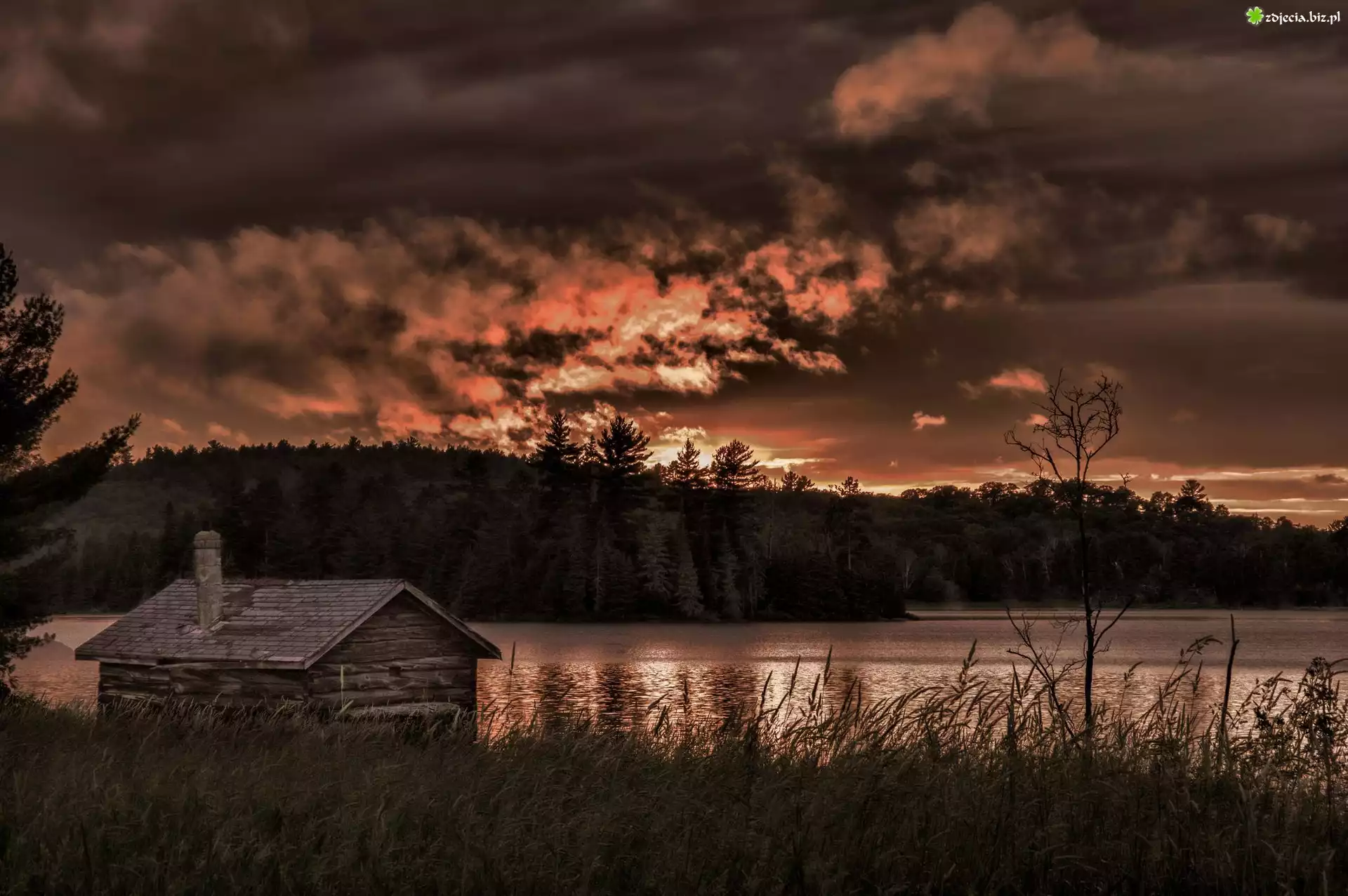 Zdjęcie Zachód, Słońca, Las, Jezioro, Domek