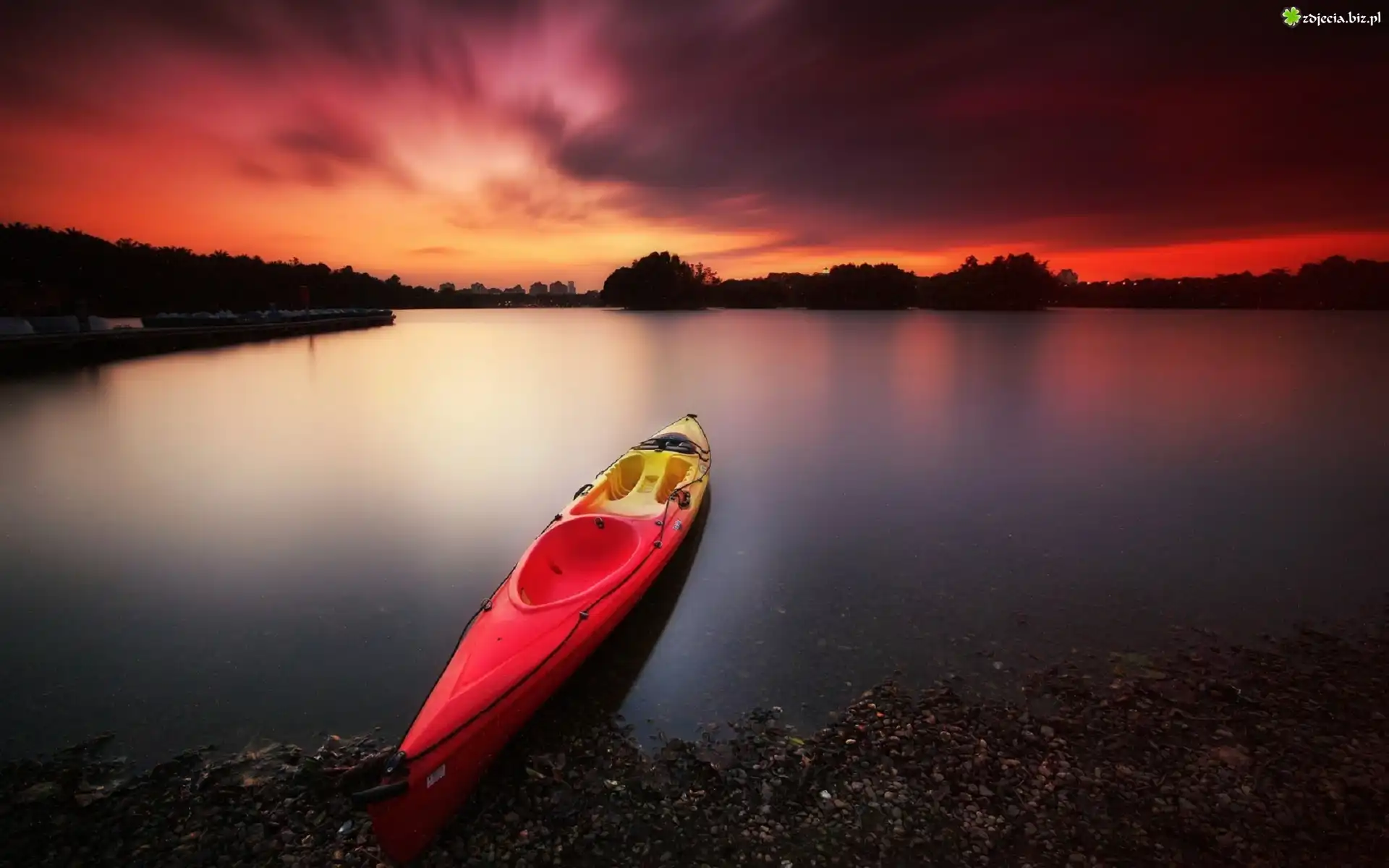 Zdjęcie Zachód, Słońca, Las, Jezioro, Kajak