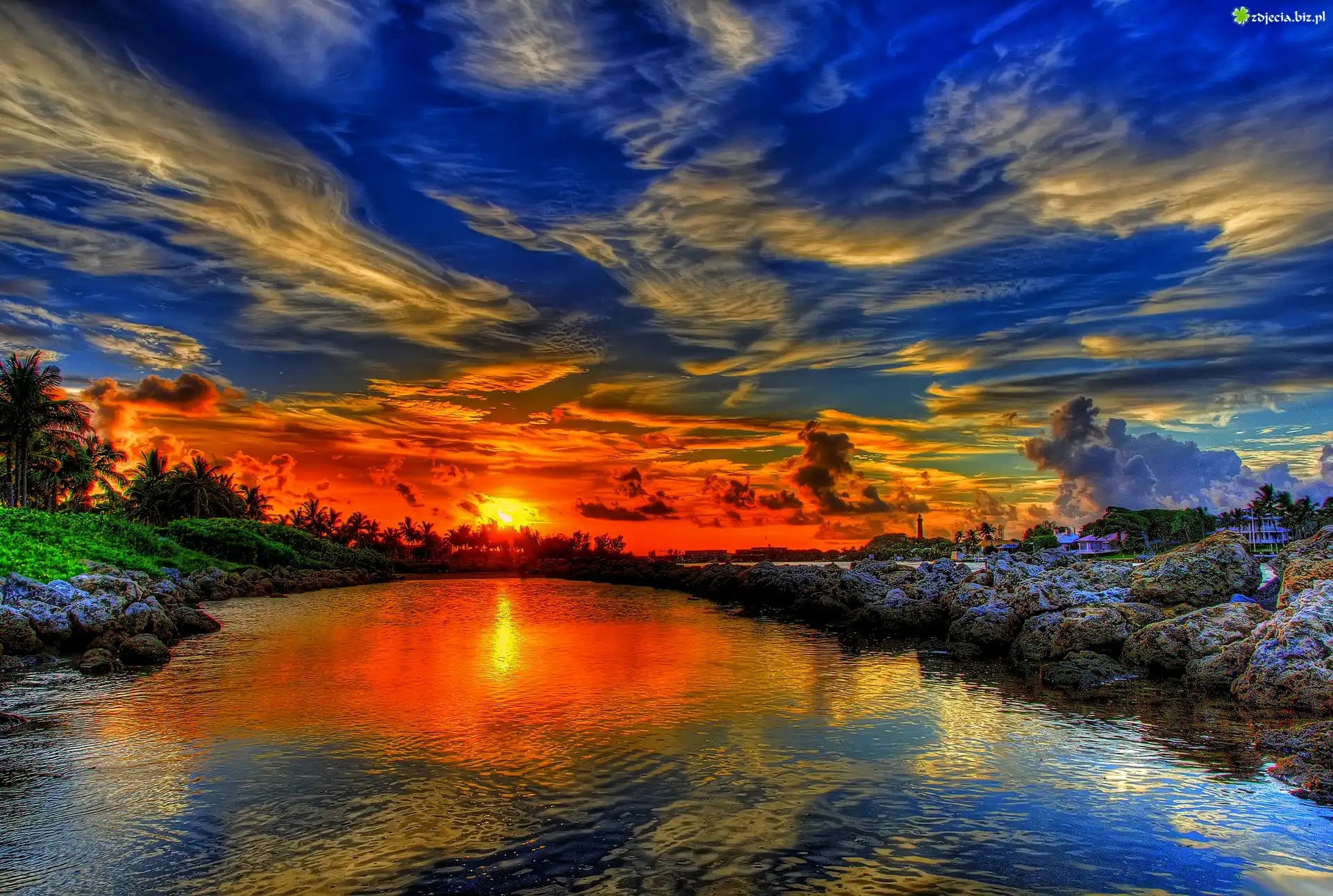 Zdjęcie Zachód, Słońca, Odbicie, Lustrzane, Jezioro, Kamienie