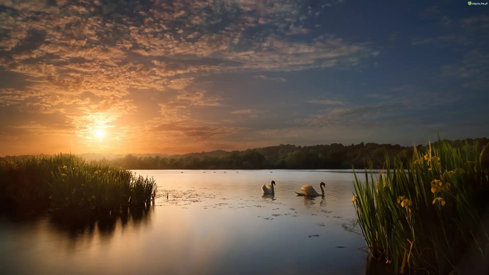 Zdjęcie Zachód słońca, Jezioro, Łabędzie