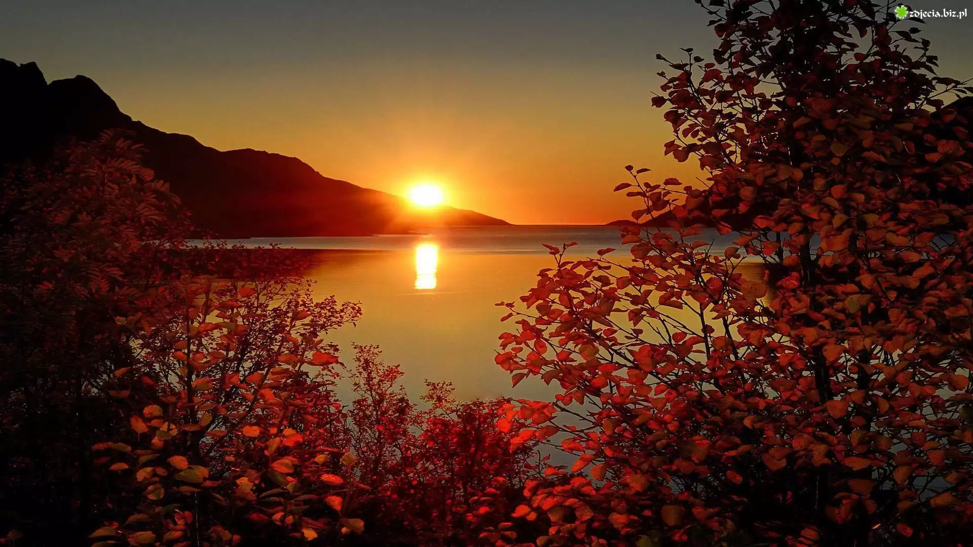 Zdjęcie Zachód, Słońca, Jezioro, Krzewy