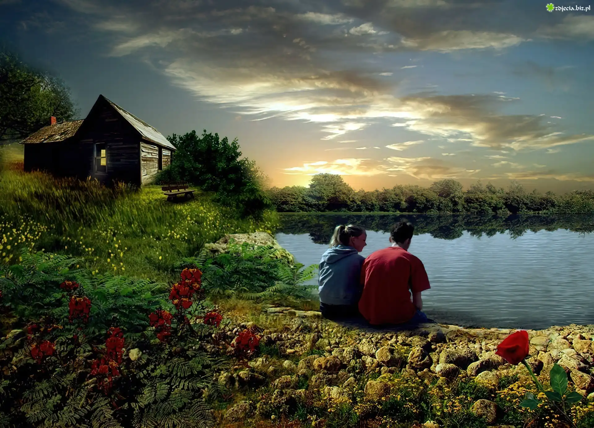 Zdjęcie Zachód, Słońca, Zakochani, Jezioro, Domek