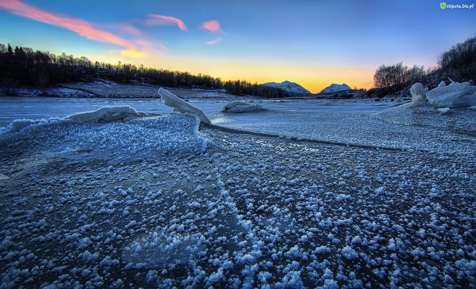 Zdjęcie Zachód, Słońca, Zamarznięte, Jezioro, Niebo