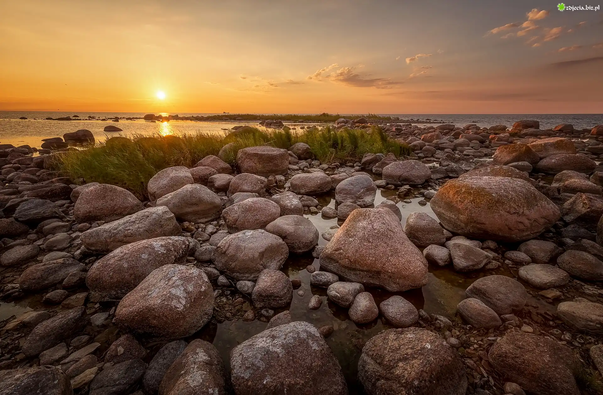 Zdjęcie Zachód słońca, Morze, Brzeg, Kamienie, Rośliny
