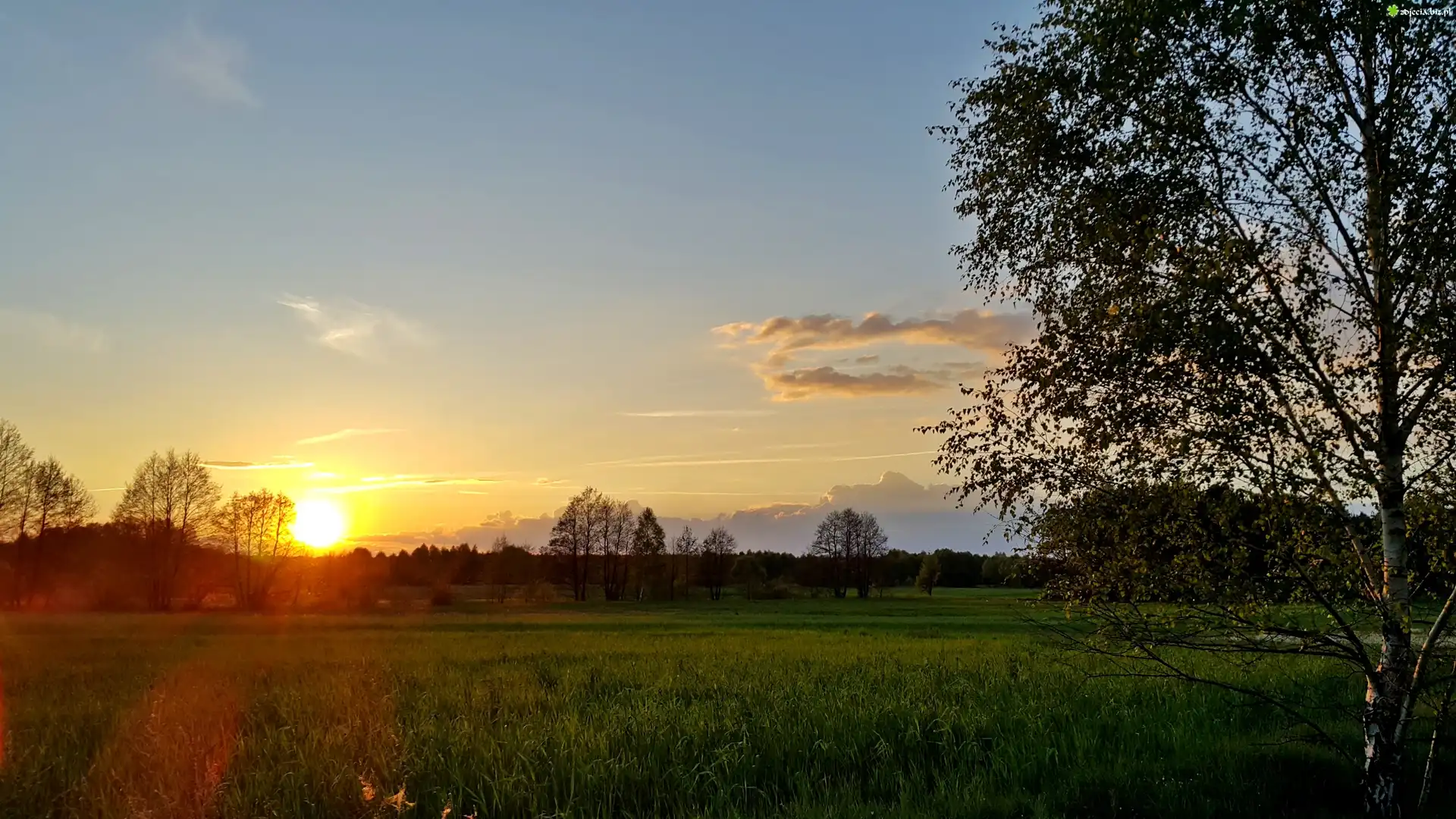 Zdjęcie Łąka, Las. Brzoza, Zachód, Słońca