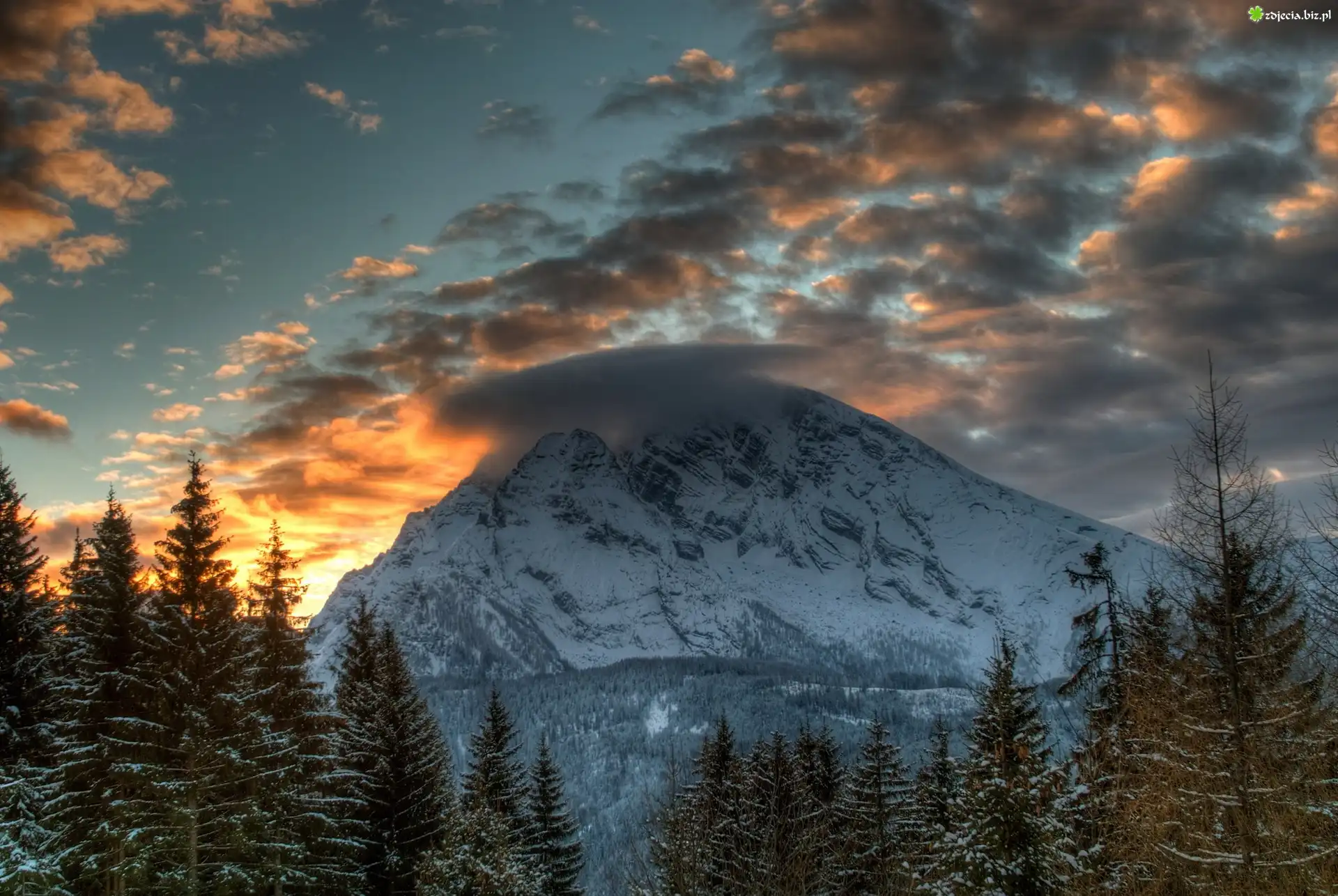 Zdjęcie Zachód, Słońca, Chmury, Góry, Las, Zima