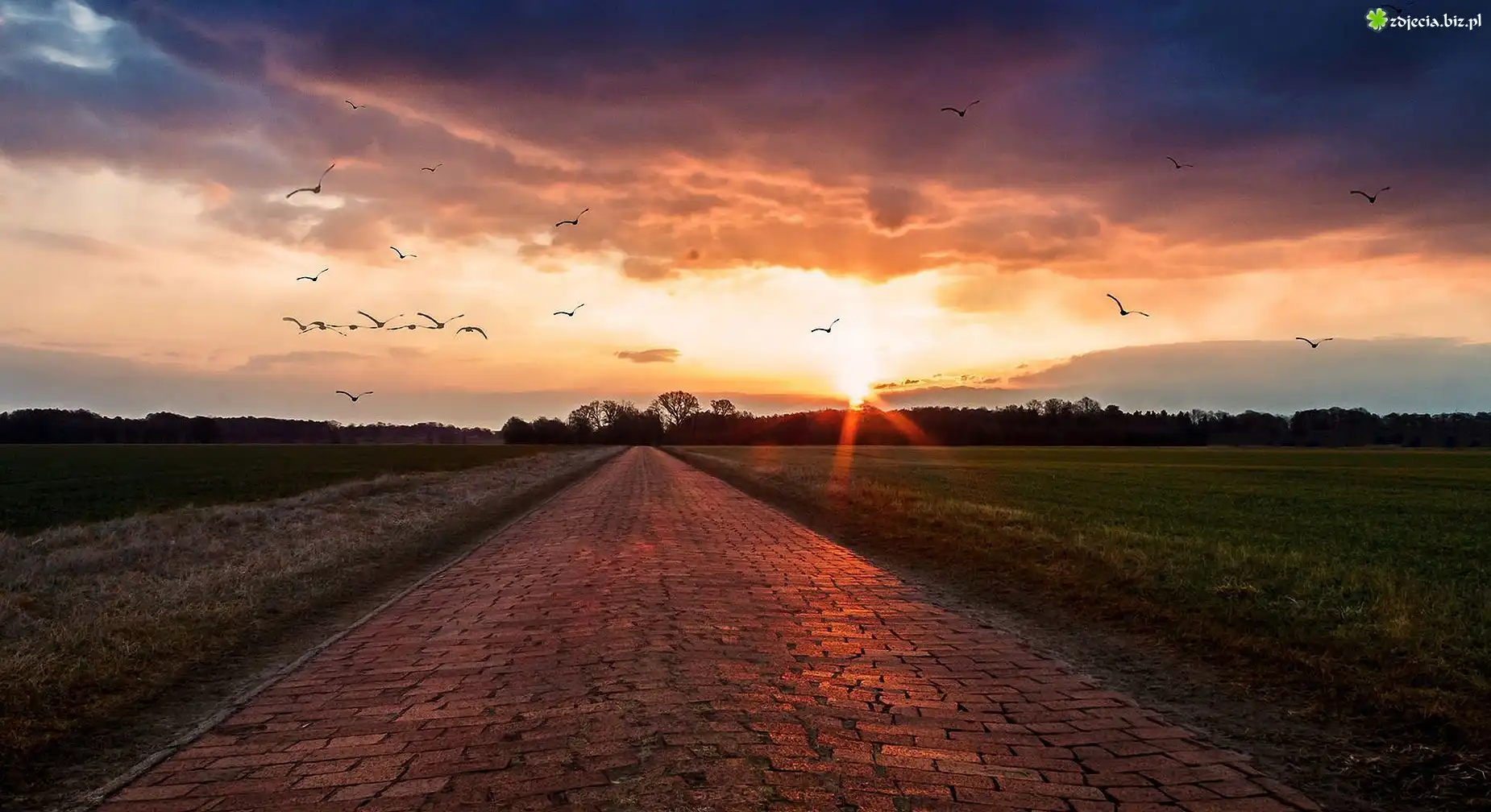 Zdjęcie Zachód, Słońca, Droga, Las, Ptaki