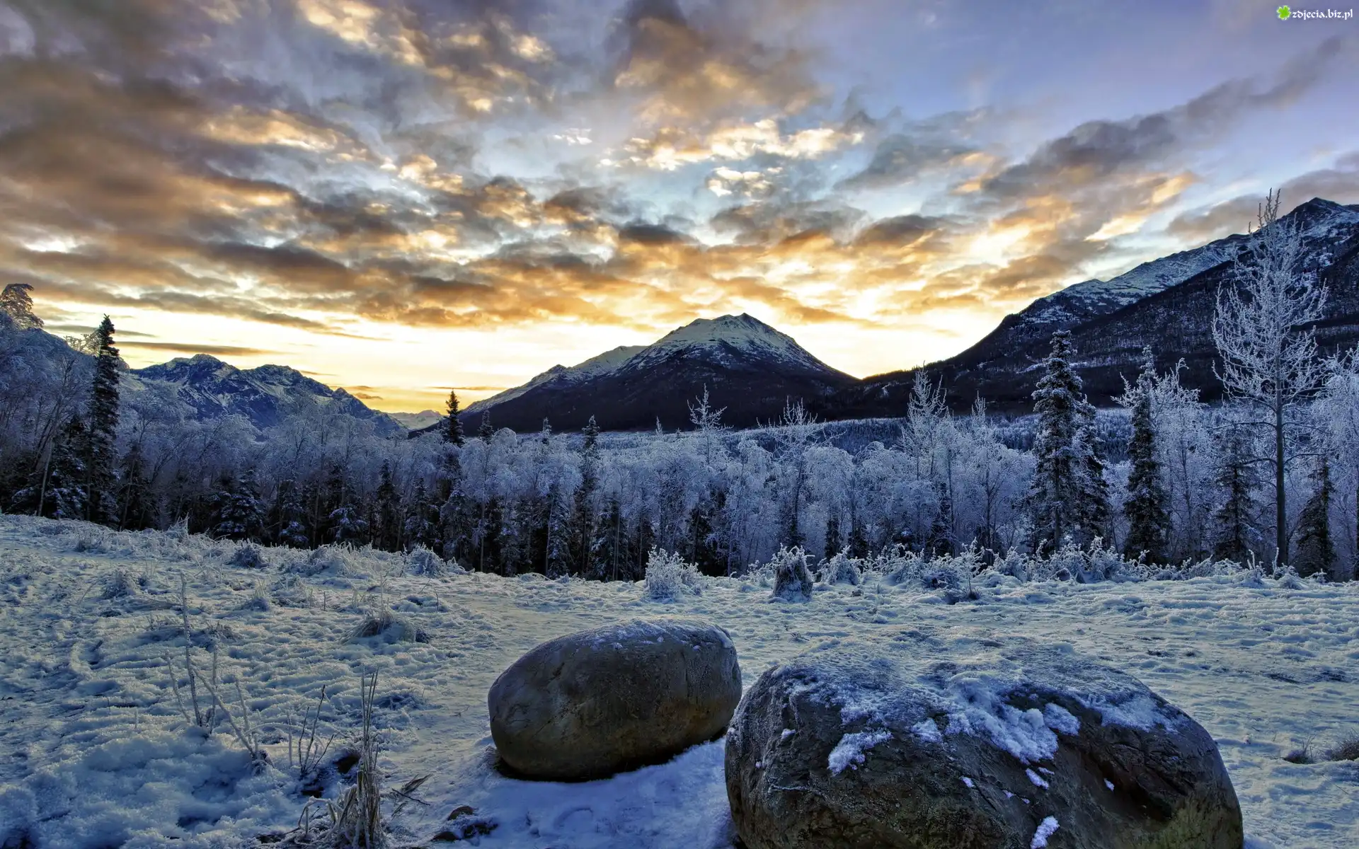Zdjęcie Zachód, Słońca, Góry, Las, Zima