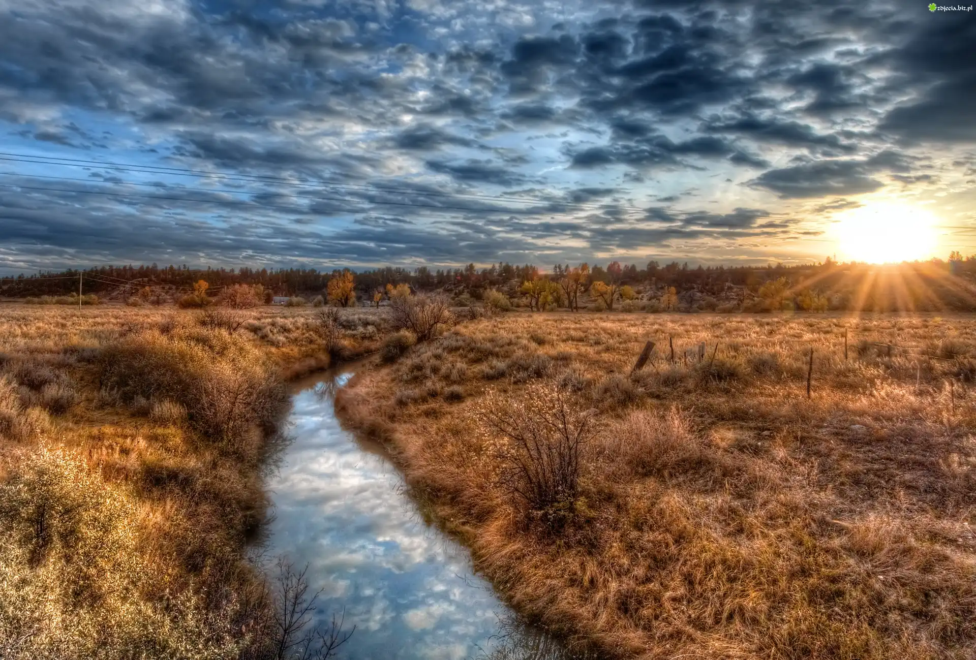Zdjęcie Zachód, Słońca, Pola, Lasy, Rzeka