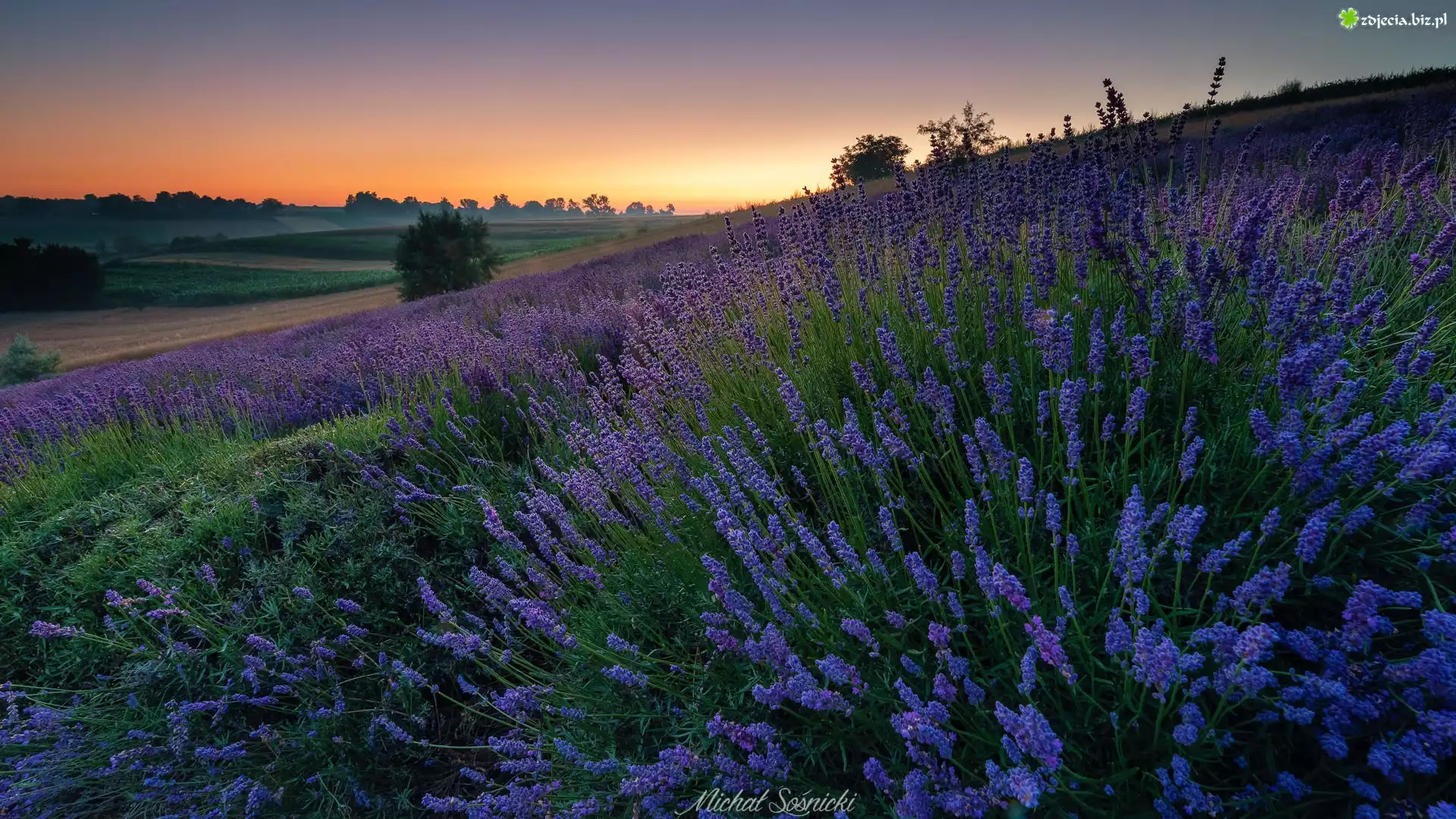 Zdjęcie Łąka, Lawenda, Drzewa, Zachód słońca