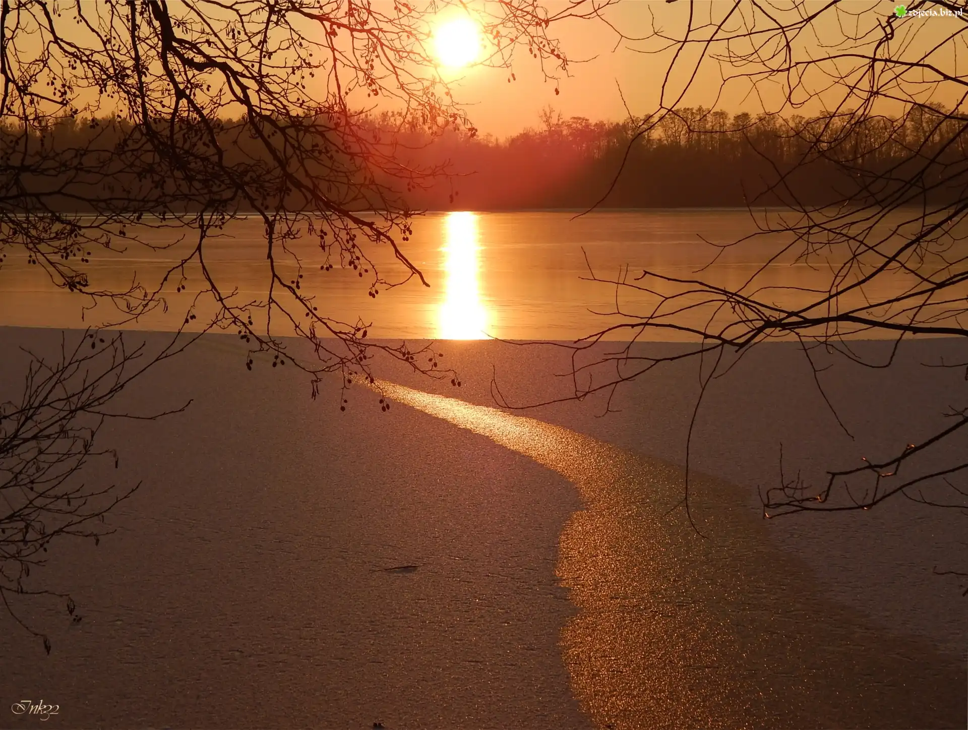 Zdjęcie, Zachód Słońca, Jezioro, Lód, Gałęzie