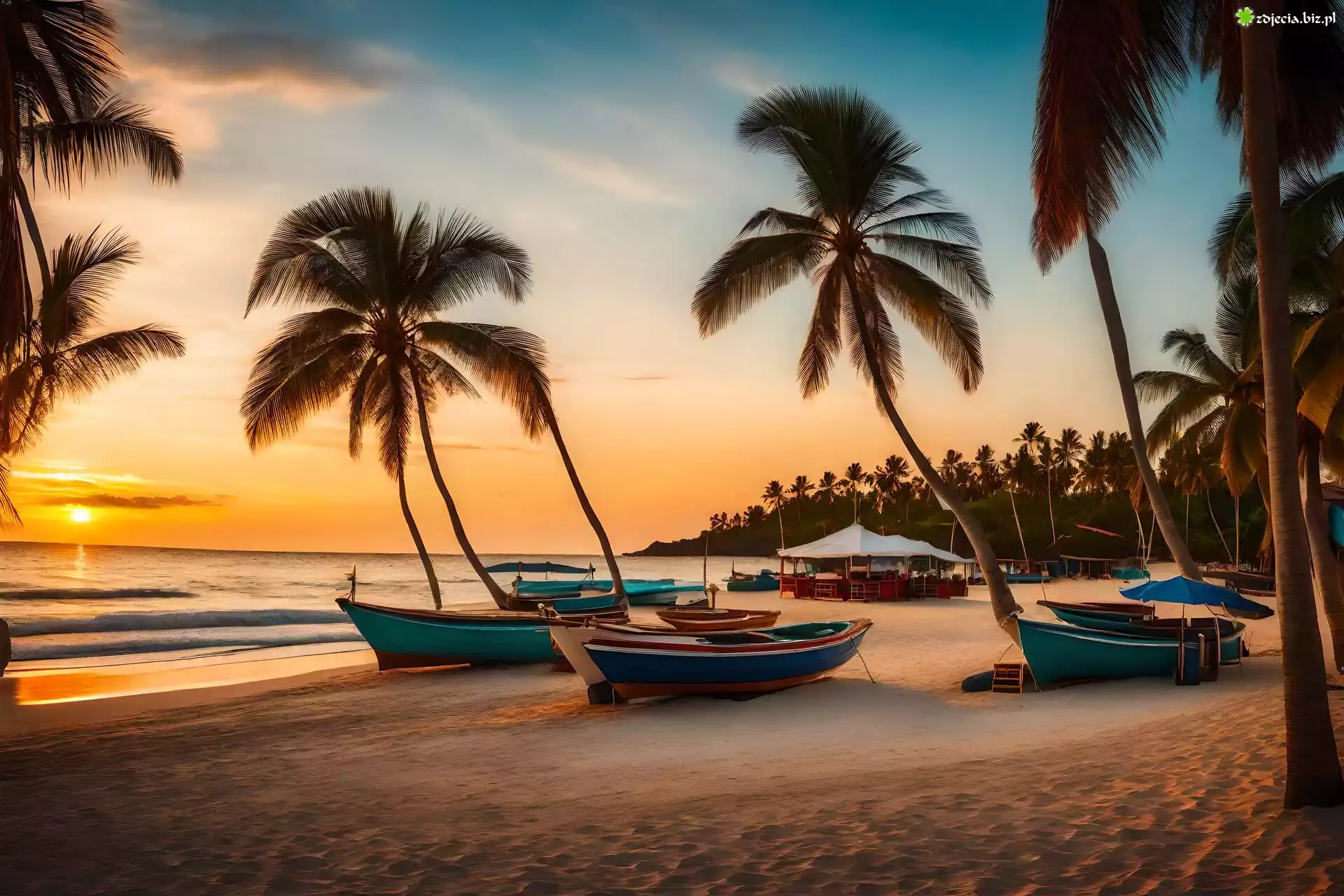 Zdjęcie Morze, Plaża, Palmy, Zachód słońca, Łódki