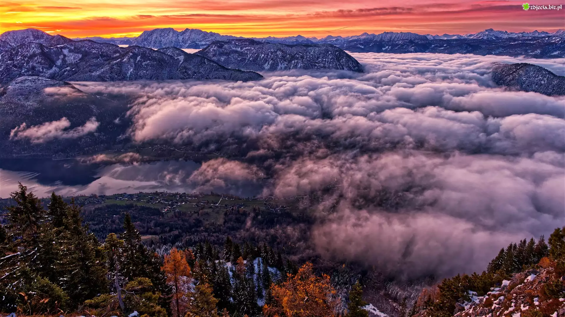 Zdjęcie Zachód słońca, Góry, Dolina, Mgła, Drzewa