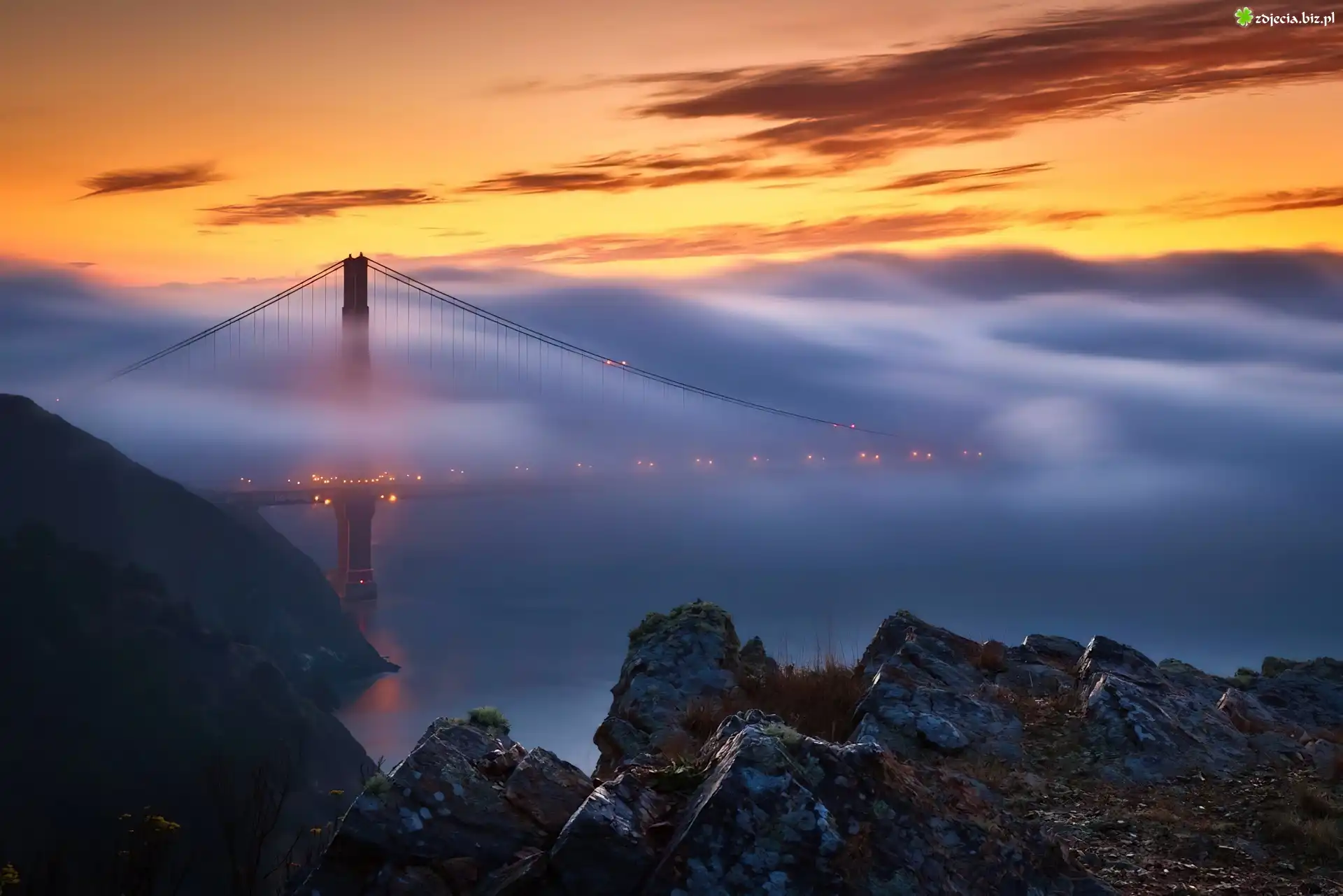Zdjęcie Zachód, Słońca, Most, Mgła, Skały