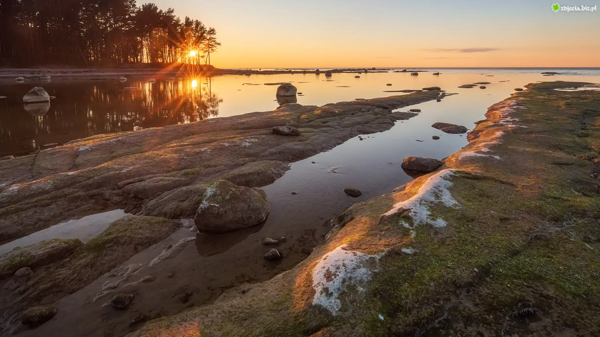 Zdjęcie Morze, Zachód słońca, Kamienie, Skały, Wysepki, Drzewa