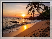Zdjęcie, Plaża, Palmy, Morze, Zachód słońca, Grafika AI