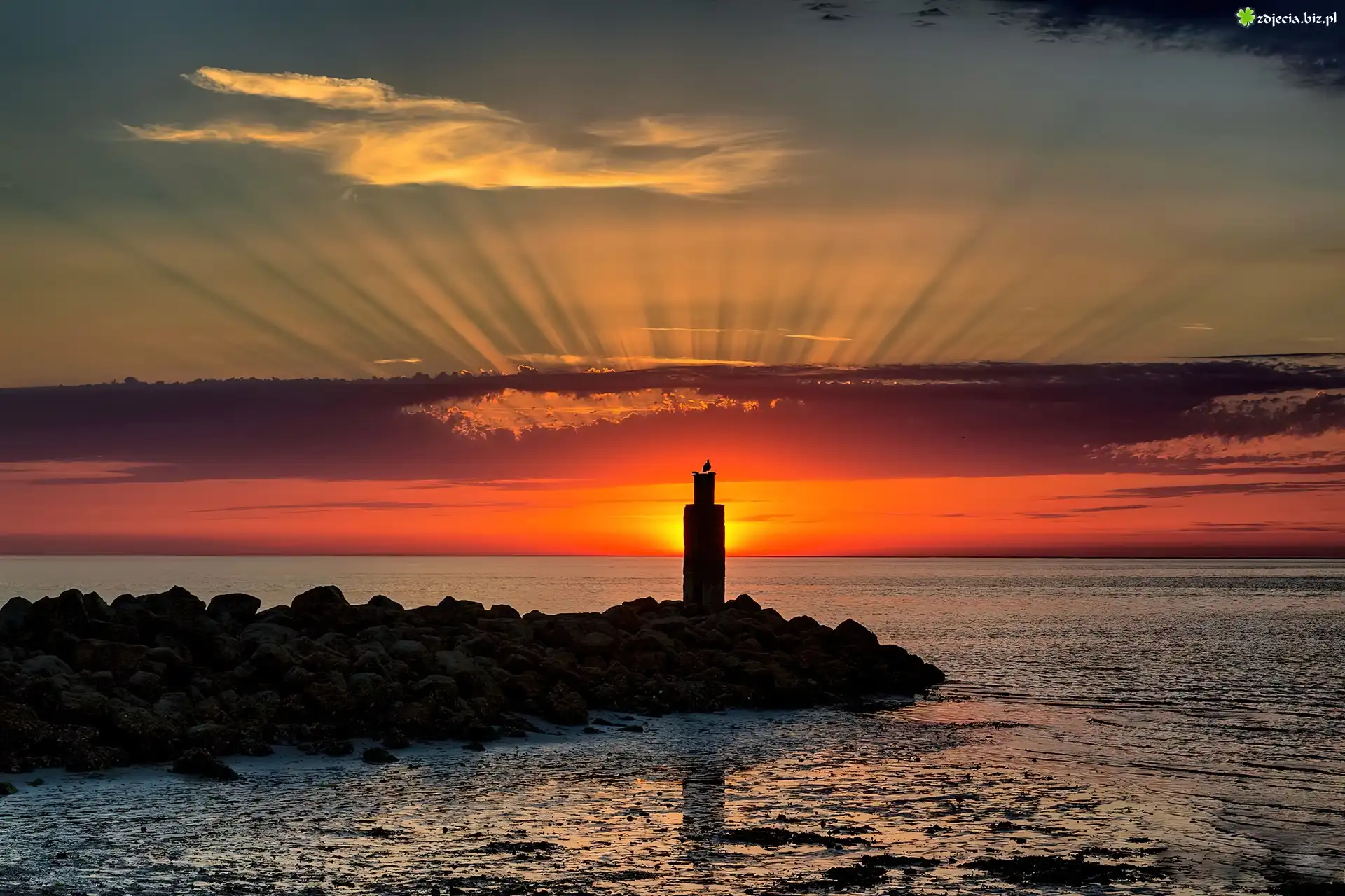 Zdjęcie Zachód, Słońca, Promienie, Morze, Latarnia