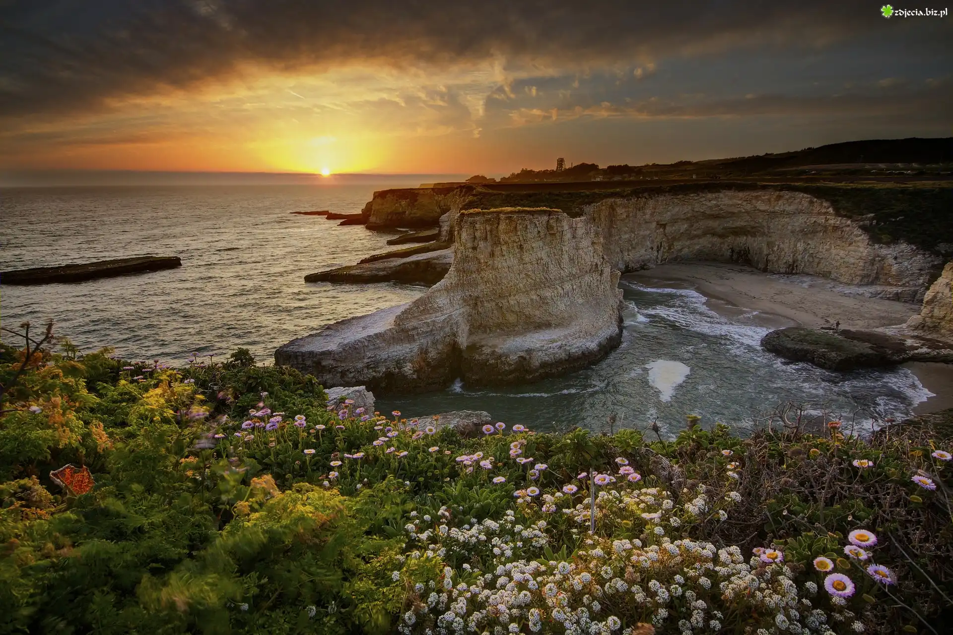 Zdjęcie, Zachód słońca, Skały, Morze, Kwiaty