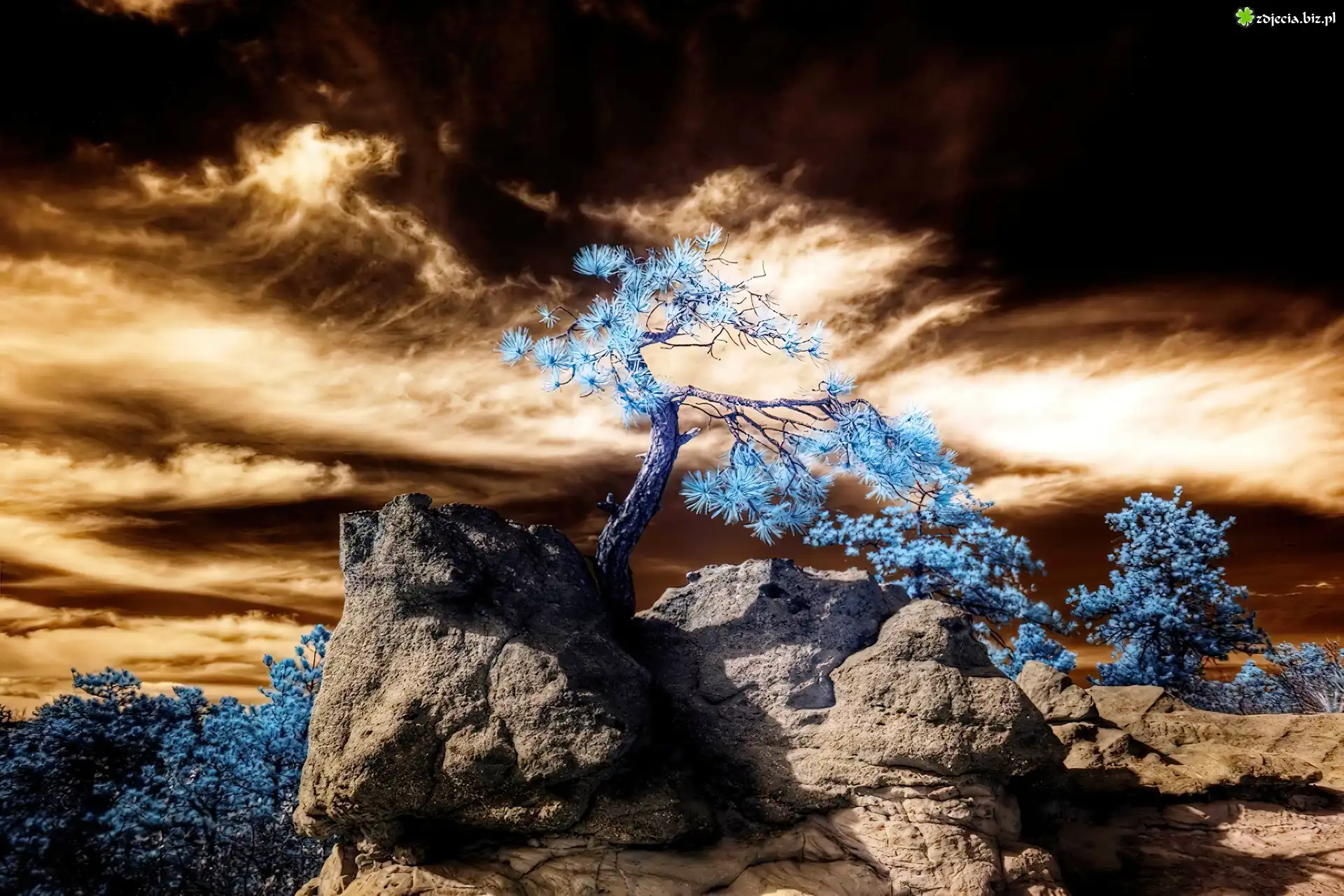 Zdjęcie Zachód, Słońca, Skały, Niebieskie, Drzewa