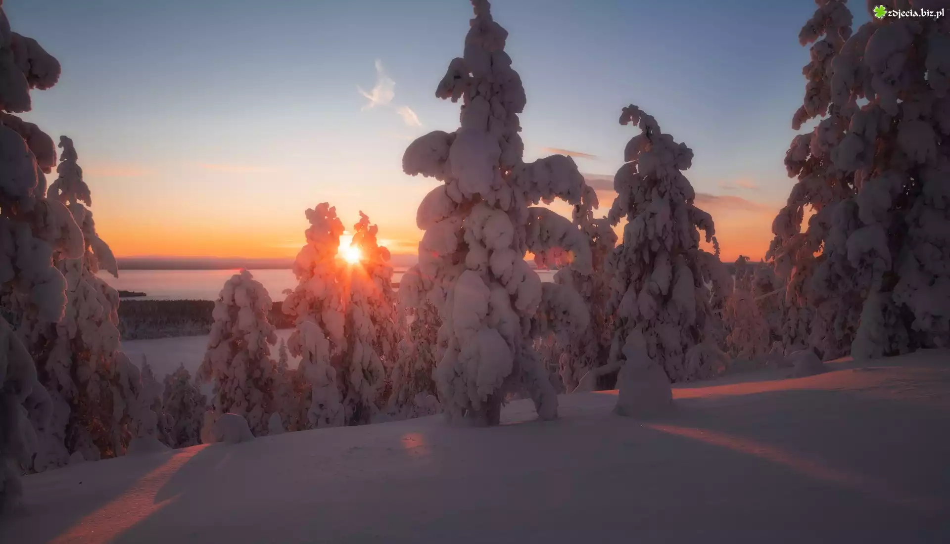 Zdjęcie Zima, Ośnieżone, Drzewa, Zachód słońca, Niebo