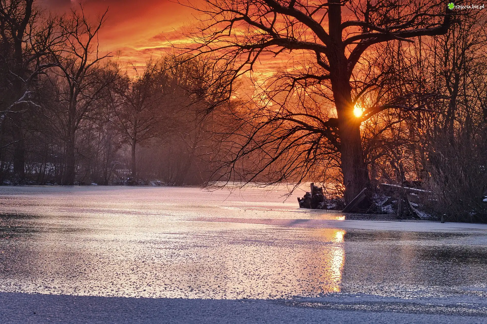 Zdjęcie, Zima, Zachód słońca, Zamarznięte, Jezioro, Drzewa, Kolorowe, Niebo