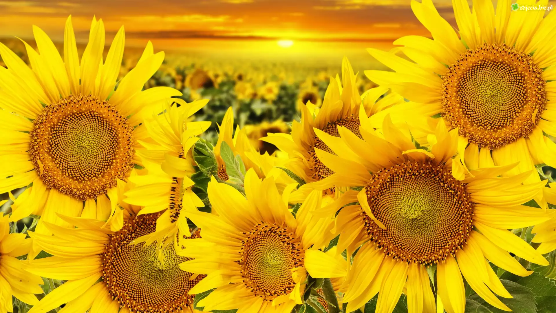 Zdjęcie Zachód słońca, Kwiaty, Żółte, Słoneczniki
