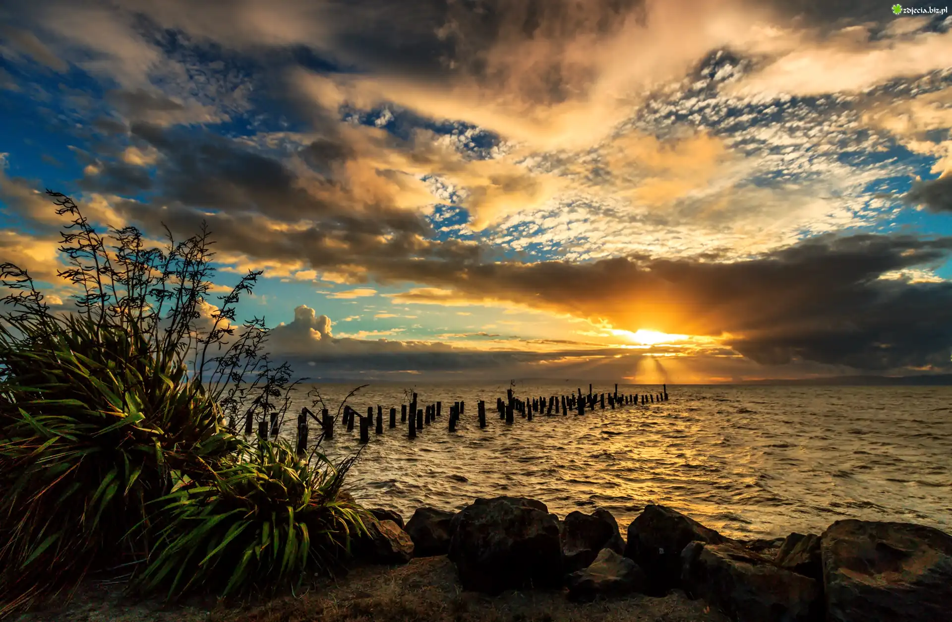 Zdjęcie Zachód słońca, Morze, Pale, Rośliny
