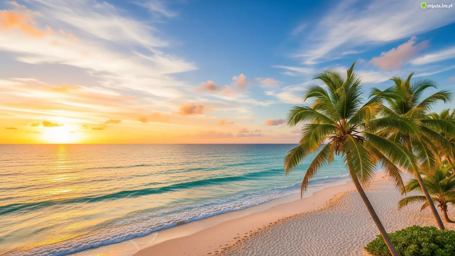 Zdjęcie Morze, Plaża, Niebo, Zachód słońca, Palmy