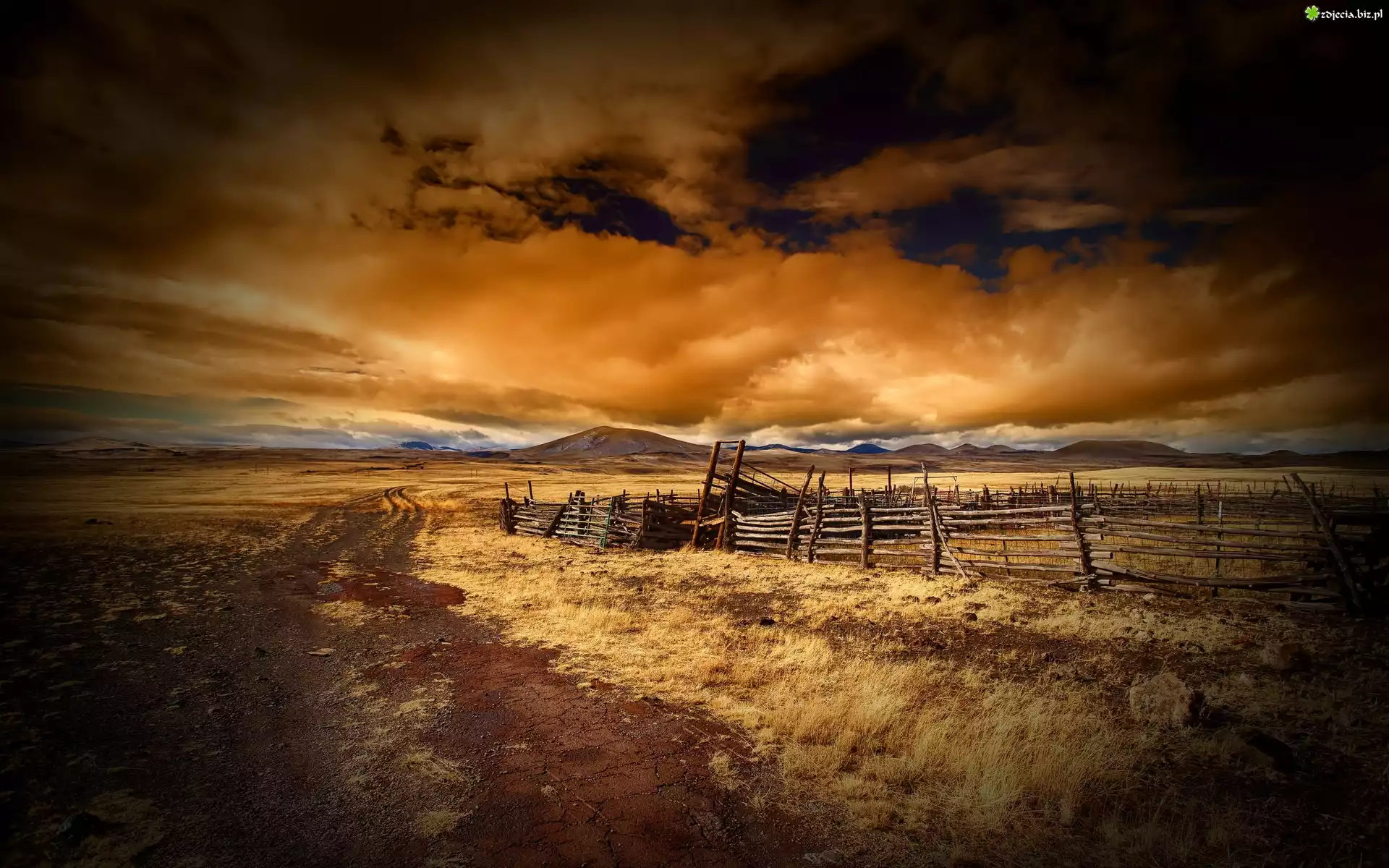 Zdjęcie, Zachód, Słońca, Chmury, Pola, Droga