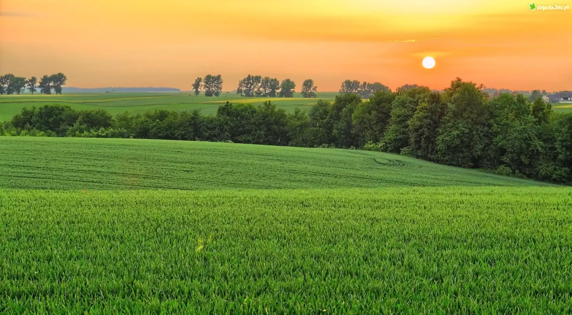 Zdjęcie Zachód, Słońca, Pola, Drzewa